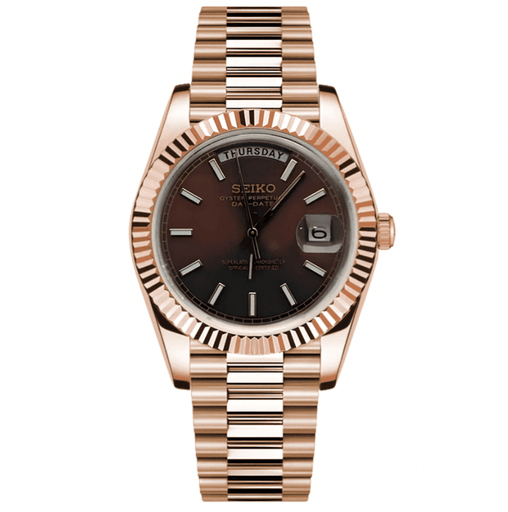 Experience the sophistication of a classic Day-Date timepiece reimagined through the craftsmanship of a modern Seiko mod. This custom build blends luxury-inspired aesthetics, premium materials, and dependable Japanese engineering—creating a watch that makes a bold statement every day.